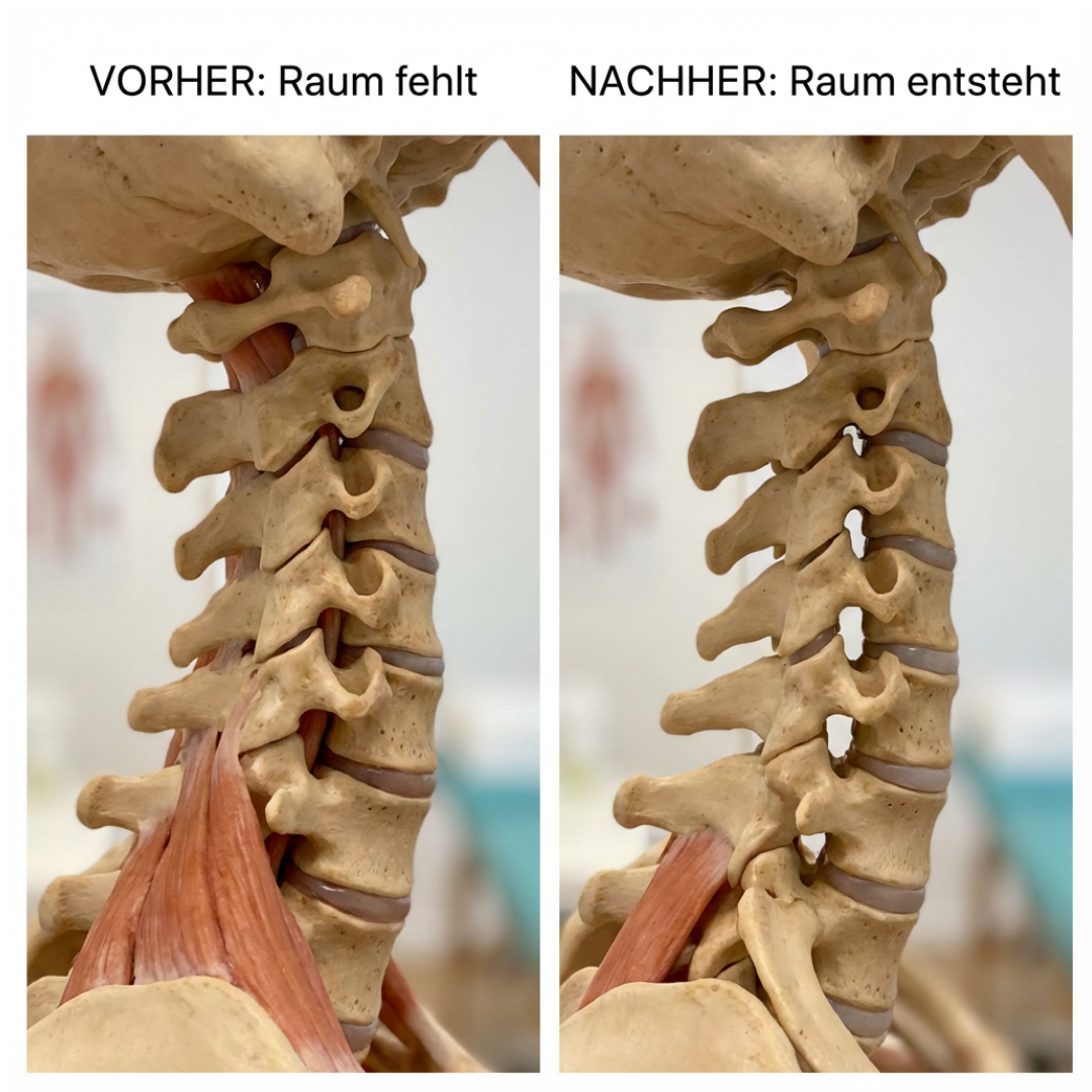 Durch eine kontrollierte, sanfte Dehnung kann der Abstand im Bereich der Halswirbelsäule unterstützt werden – ohne ruckartige Belastung, ohne Zwang. Viele empfinden dabei, wie sich Druck reduziert und der Nacken sich wieder freier anfühlt.