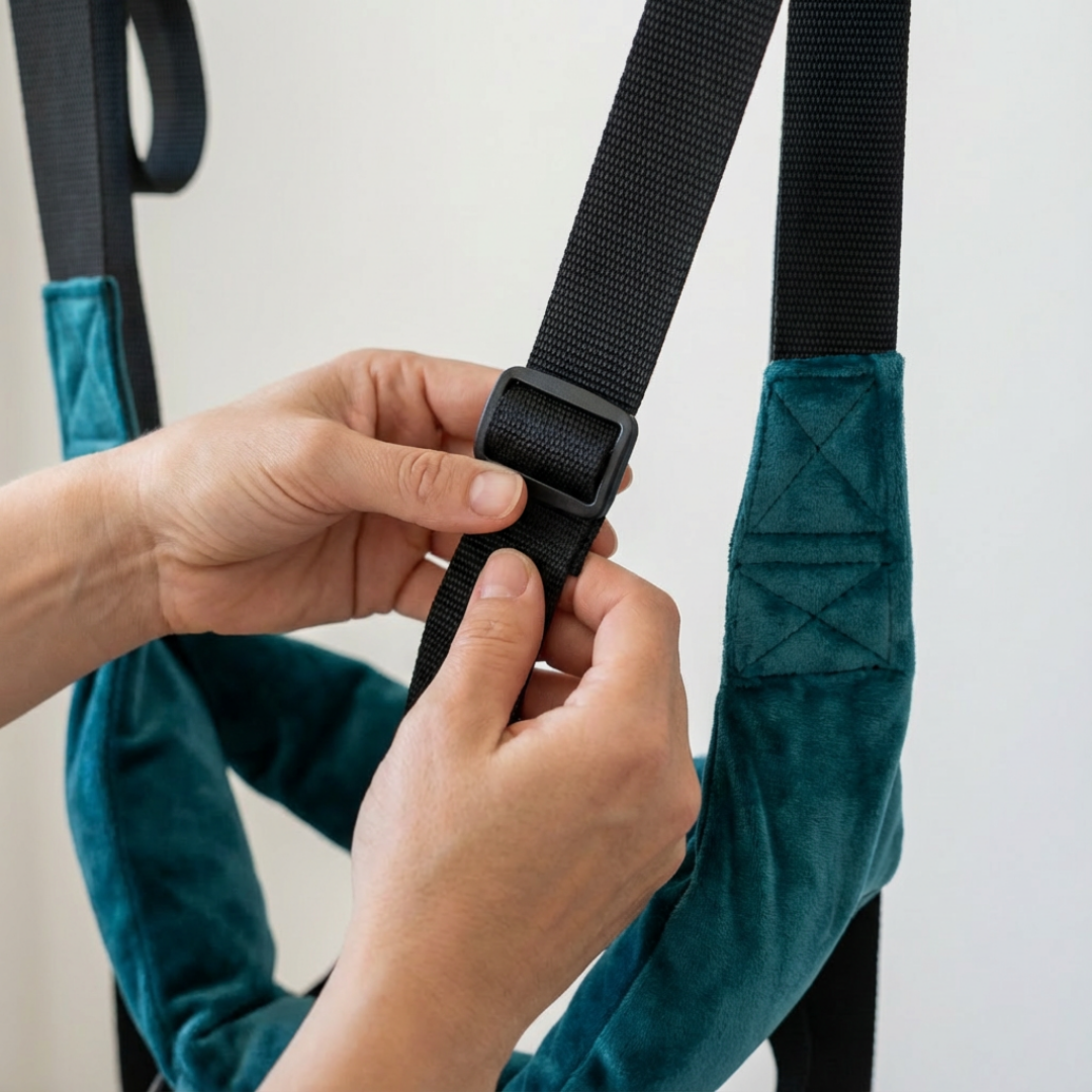 Die gepolsterte Schlaufe liegt angenehm am Nacken an. Durch dein eigenes Körpergewicht entsteht eine sanfte, kontrollierte Dehnung. Du bestimmst Tempo und Intensität selbst – ohne ruckartige Bewegungen. So kann sich Druck im Nacken- und Schulterbereich schrittweise lösen. Die Wirbelsäule wird entlastet, ohne überdehnt zu werden. Schon wenige Minuten reichen aus, um spürbar Spannung loszulassen.