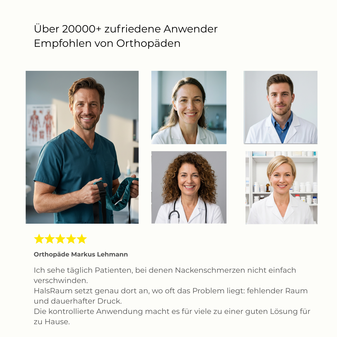 „Ich nutze HalsRaum abends nach der Arbeit. Schon nach wenigen Minuten fühlt sich mein Nacken deutlich leichter an. Kein Ziehen, kein unangenehmer Druck.“