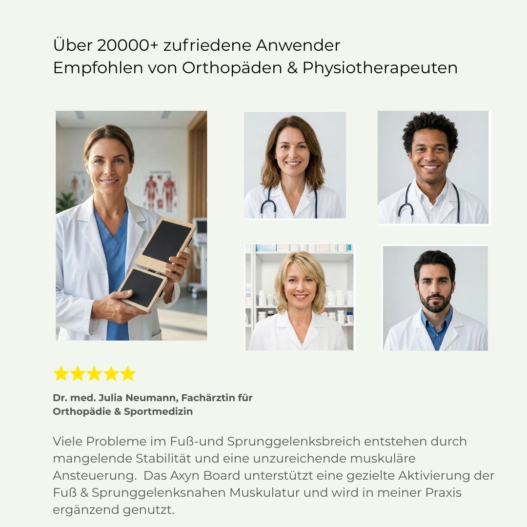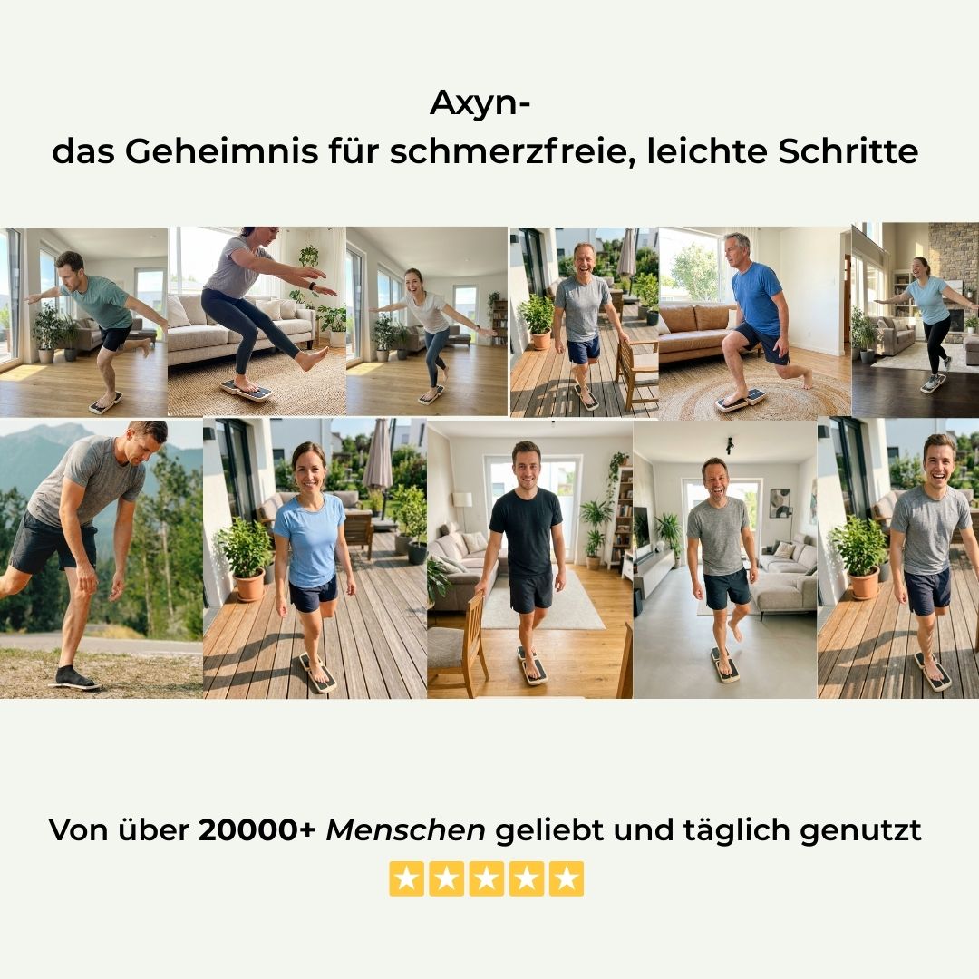 Regelmäßige, gezielte Balance- und Stabilisationsübungen können die Wahrnehmung und Ausrichtung von Fuß und Sprunggelenk verbessern. Axyn unterstützt eine kontrollierte Aktivierung der umliegenden Muskulatur – für ein stabileres, bewussteres Standgefühl.