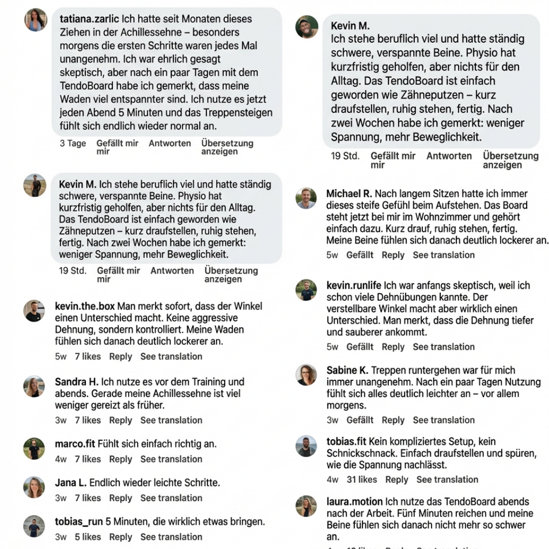 Ich hatte morgens immer diesen stechenden Schmerz in der Ferse. Nach ein paar Tagen mit dem Tendoboard fühlen sich meine Waden deutlich lockerer an. Gehen ist endlich wieder angenehm.